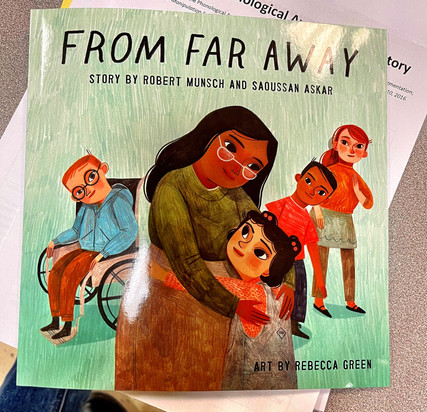 This month, I was introduced in school to the Robert Munsch picture book From Far Away – a beautiful story about a refugee family from war-torn Lebanon, seeking solace and safety in Canada. 📖 It is a wonderful portrayal of the difficulties immigrant children have adjusting. Saoussan is advised to change her name to Susan, so others can pronounce it. Her mom tells her to change it back. And what a novel idea, keeping your cultural name. Times have changed. People grow. 💯